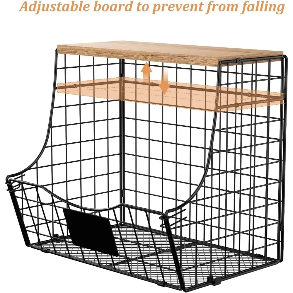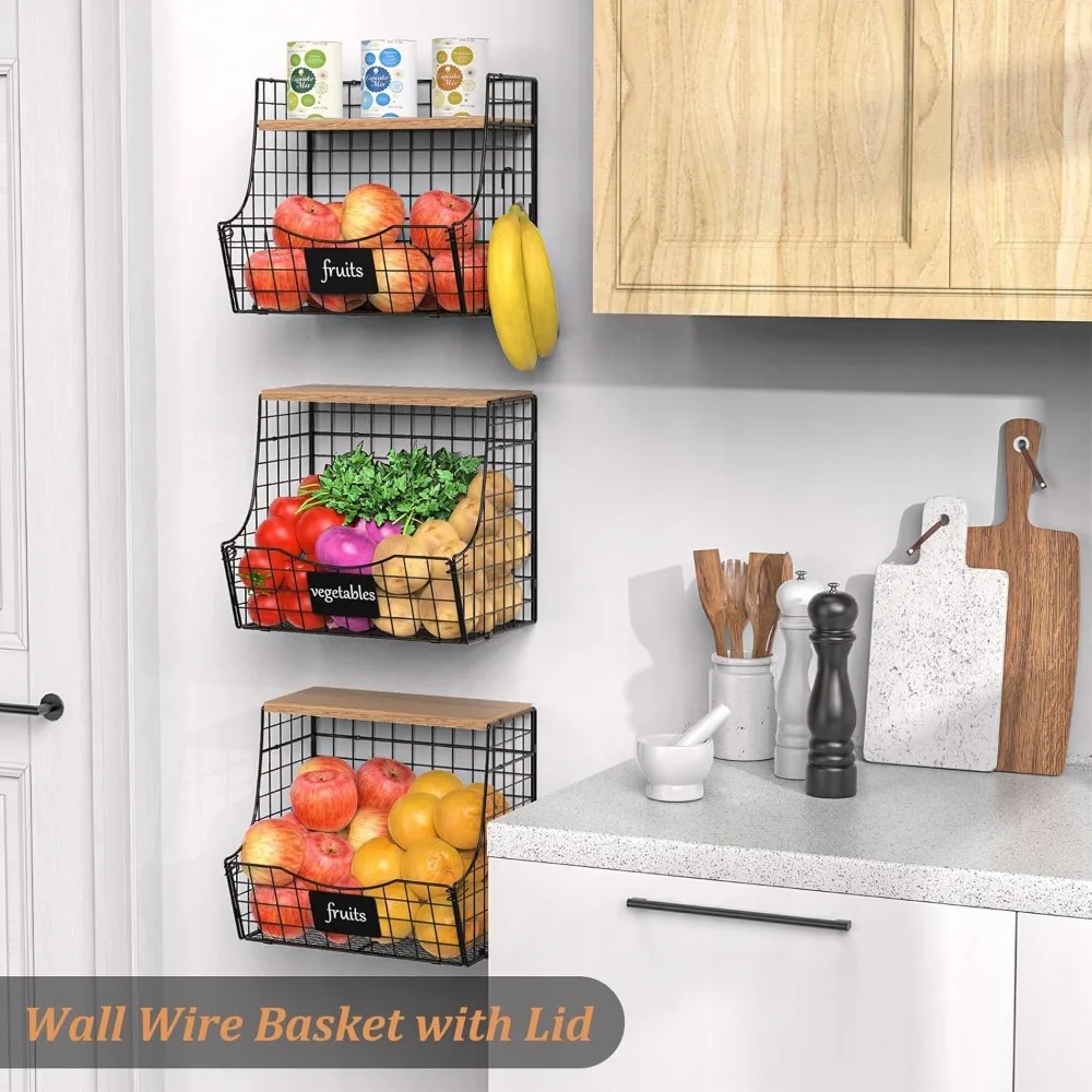 Keep your kitchen organized and stylish with this 3-pack set of stackable fruit and vegetable storage baskets. Each basket comes with a sleek wooden lid and a nameplate for easy identification, perfect for storing onions, potatoes, and other produce. Designed for both counter and wall mounting, these versatile baskets save space and add a touch of rustic charm to your kitchen. Durable and stackable, they provide practical storage while keeping your fruits and vegetables fresh and accessible.