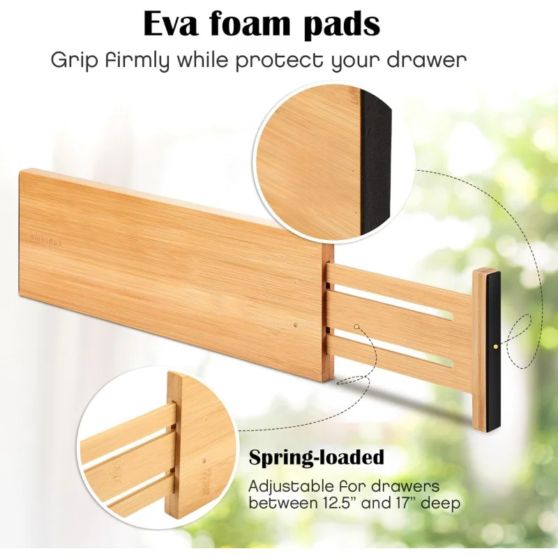 Keep your drawers neat and organized with this 6-pack set of bamboo drawer dividers. Designed with soft foam ends to protect your furniture, these wooden dividers are perfect for dresser drawers, nursery storage, or kitchen organization.