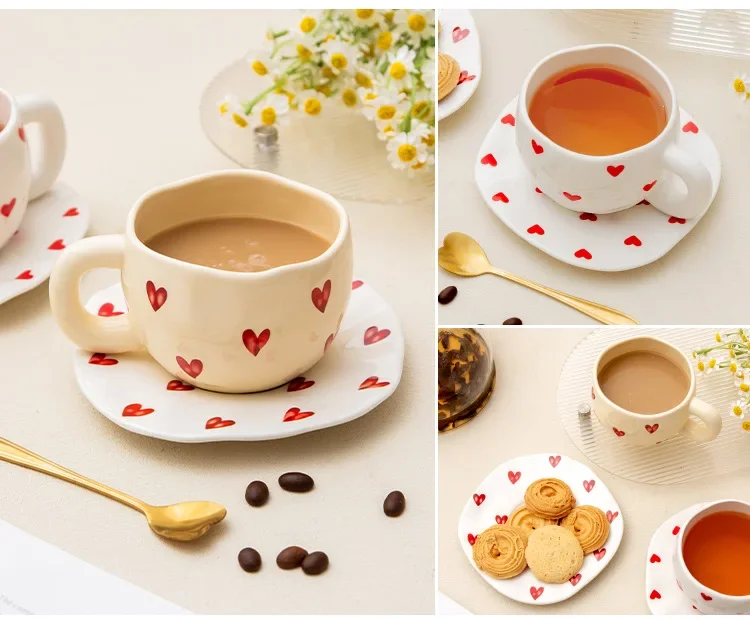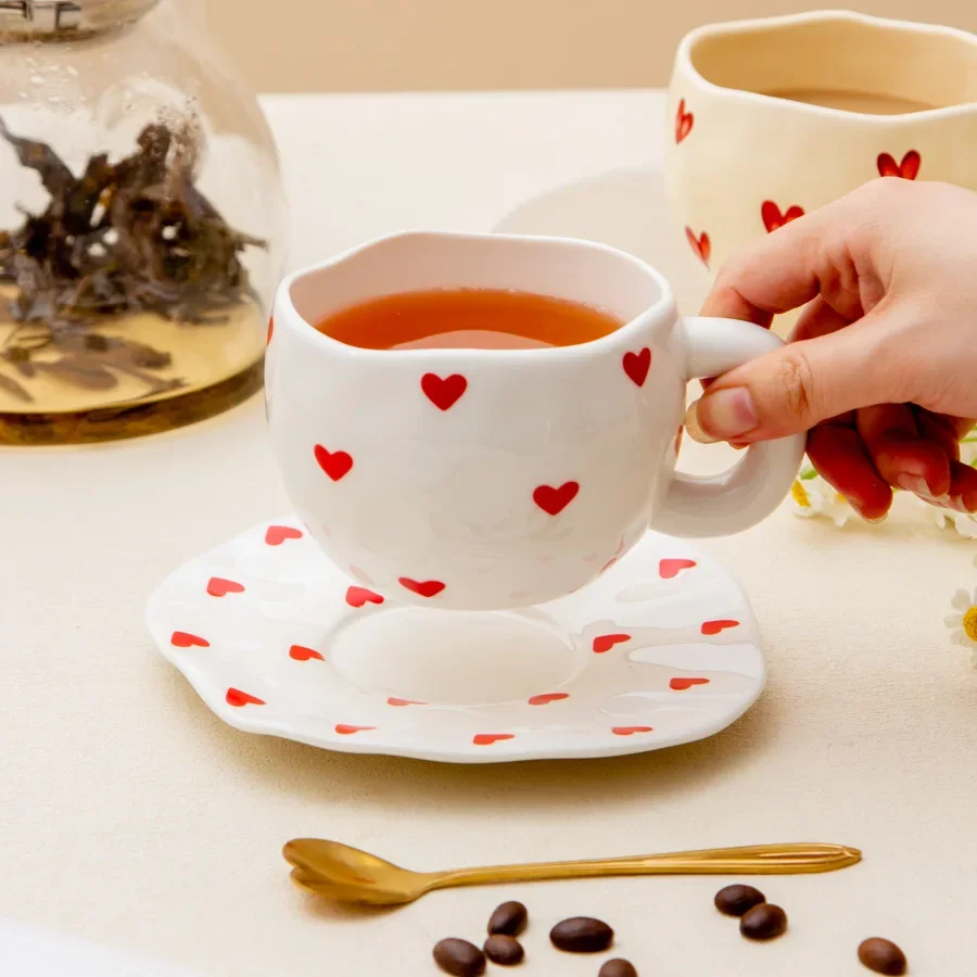 Cute Handmade Heart-Shaped Ceramic Coffee Cup & Plate Set