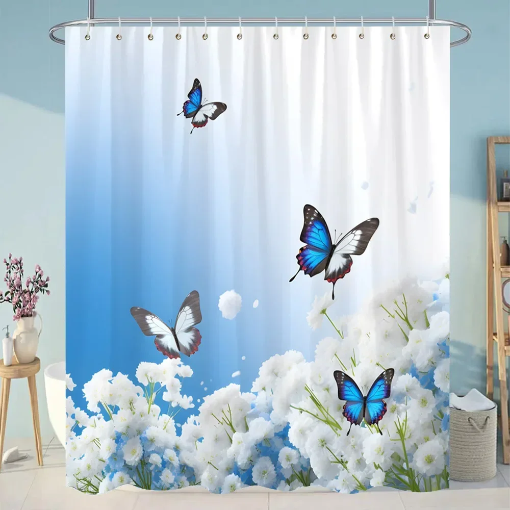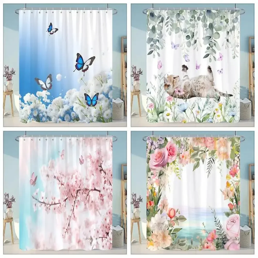 Transform your bathroom into a serene garden with this Beautiful Plant Flower Shower Curtain. Featuring eucalyptus leaves, cherry blossoms, cats, and butterflies, the vibrant design adds charm and personality while keeping your shower area dry and protected.