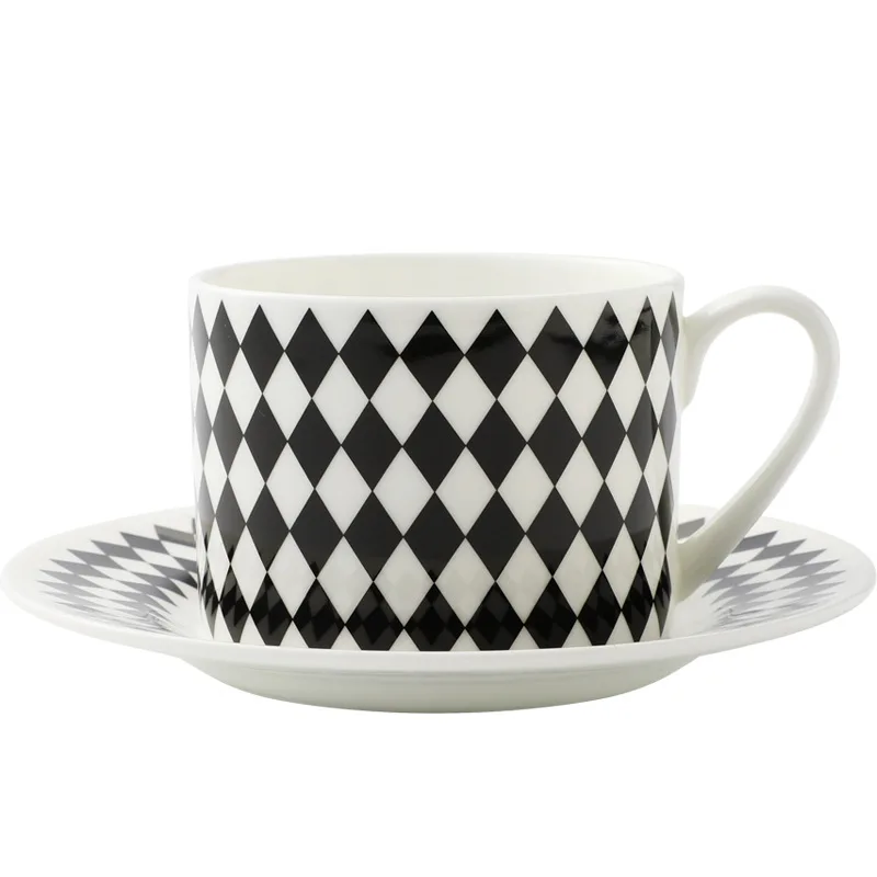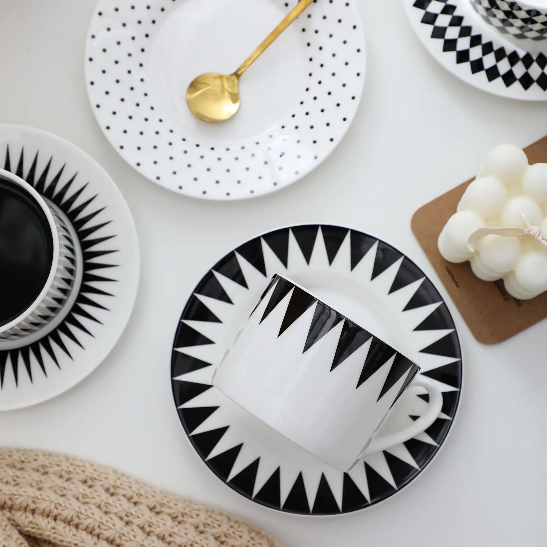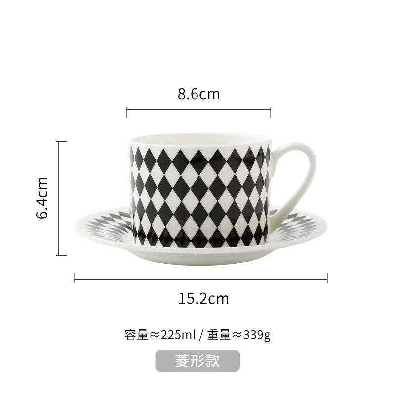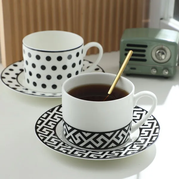 Elevate your coffee or tea experience with this bone china cup and saucer set, featuring a modern black and white geometric design. Perfect for afternoon tea, coffee breaks, or gifting to couples, these cups combine elegance and functionality.