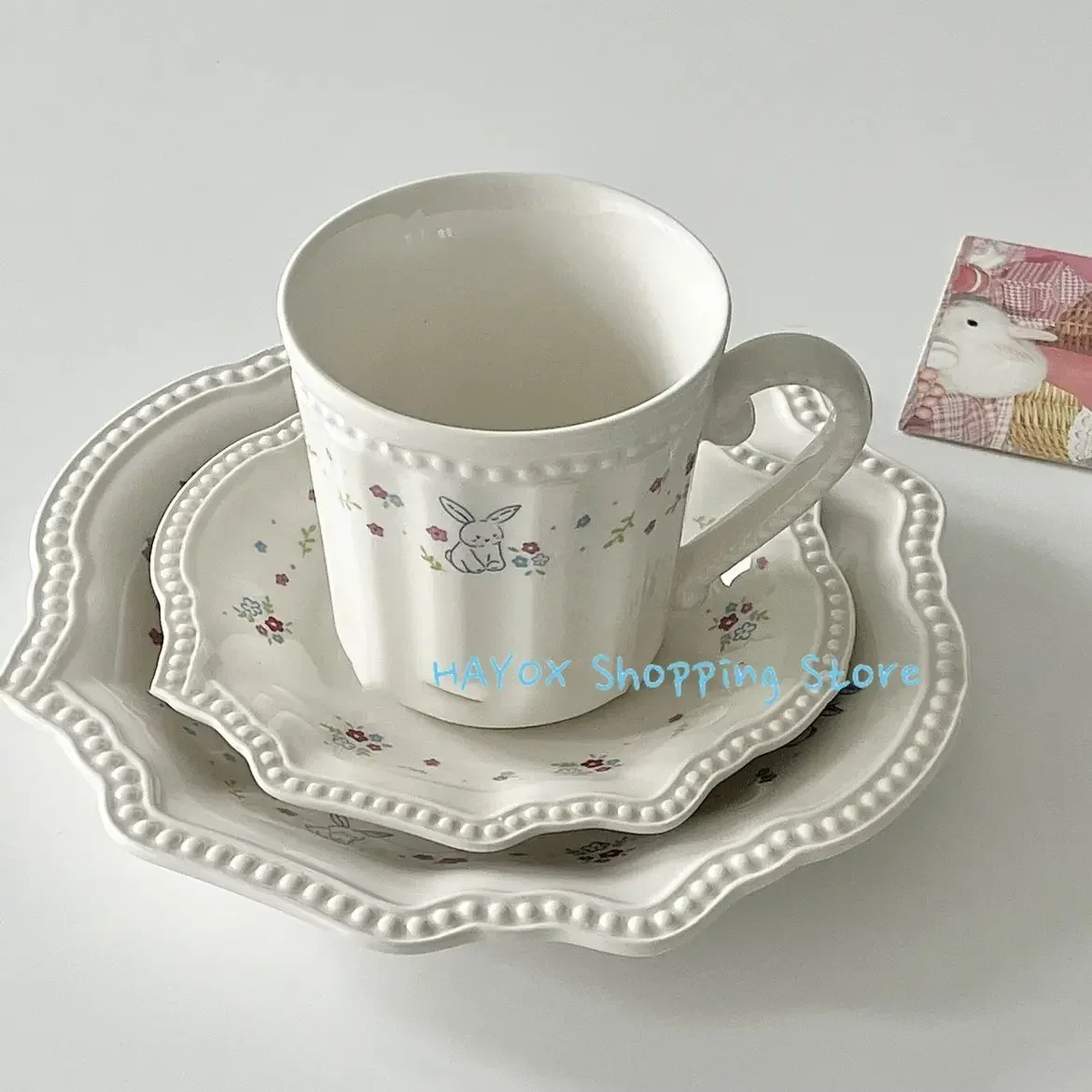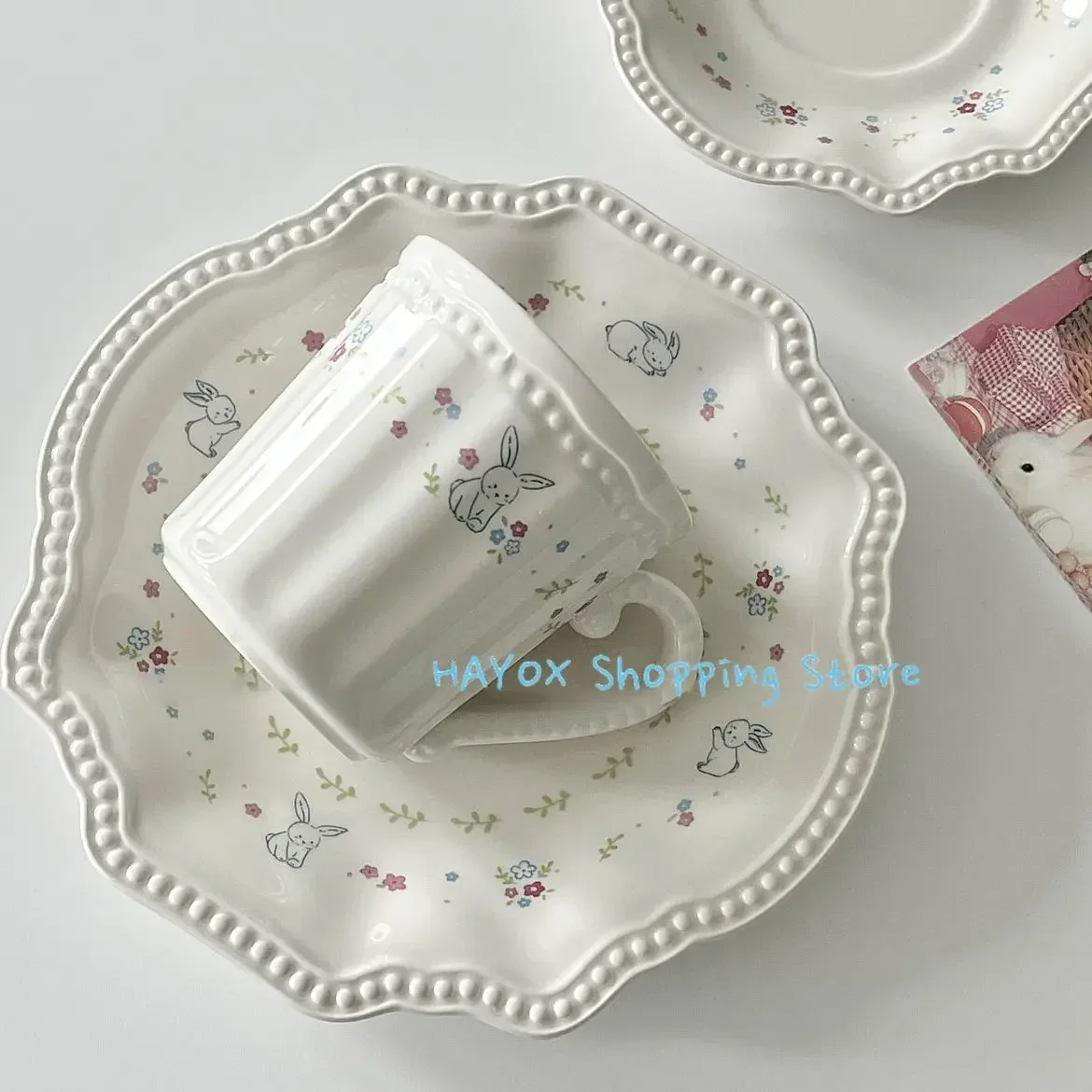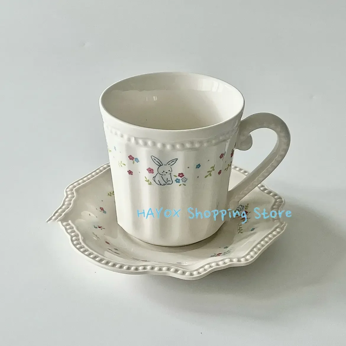 Featuring an adorable rabbit and delicate floral print, this cup and saucer set adds a touch of charm and elegance to any table. Perfect for girls, tea parties, or as a thoughtful gift, it combines functionality with a delightful vintage aesthetic. Enjoy your favorite beverages in style with this charming ceramic mug set.