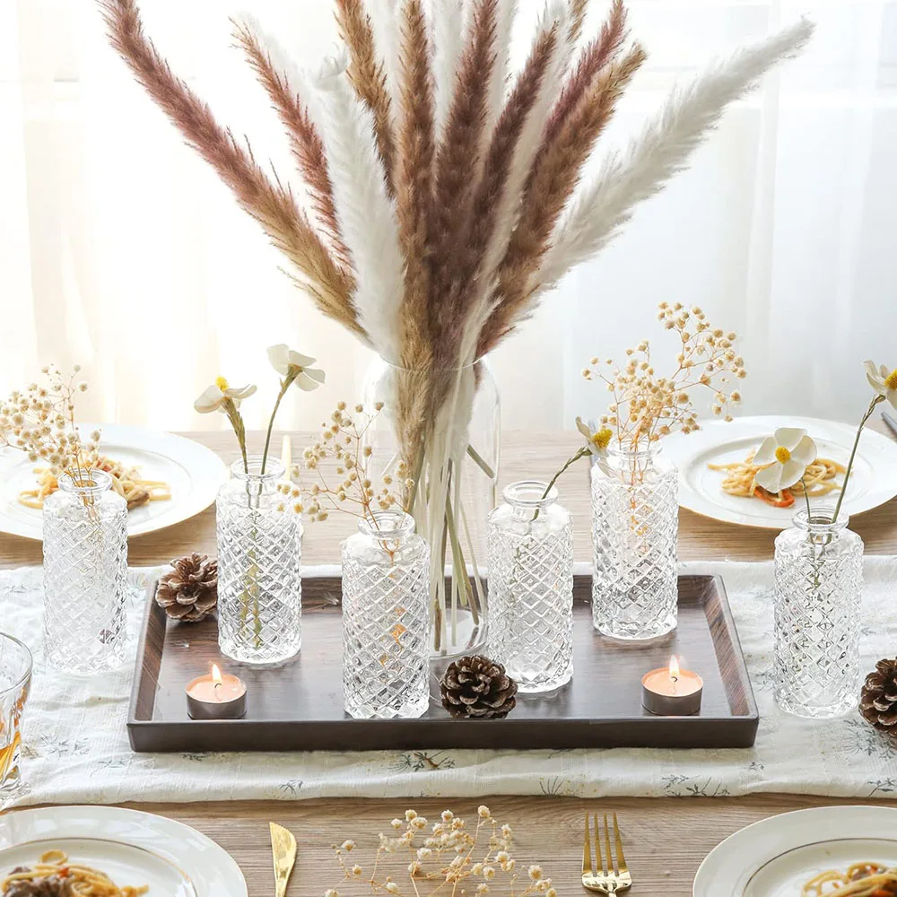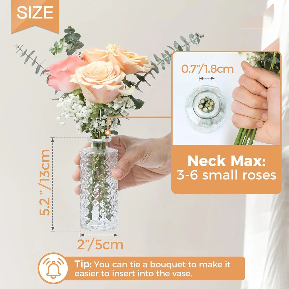 Available in bulk, these mini vases are versatile and ideal for showcasing single blooms or small floral arrangements. Their clear, faceted design catches the light beautifully, making them a stylish and functional addition to any event or living space.