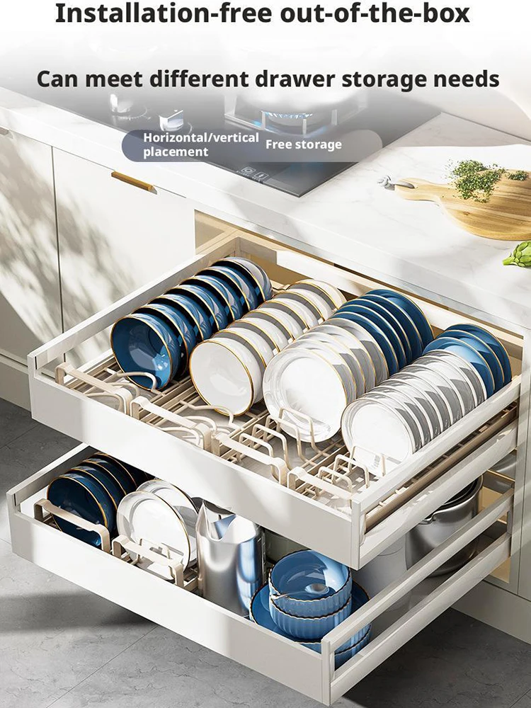 Keep your kitchen neat and organized with this Pull-Out Stainless Steel Cabinet Dish & Bowl Organizer Rack. Designed for built-in drawers or cabinets, this sturdy rack provides convenient storage for plates, bowls, and other kitchenware, allowing easy access while maximizing space.