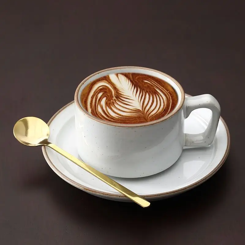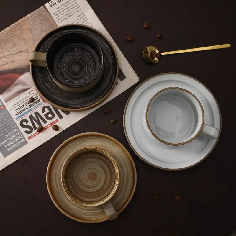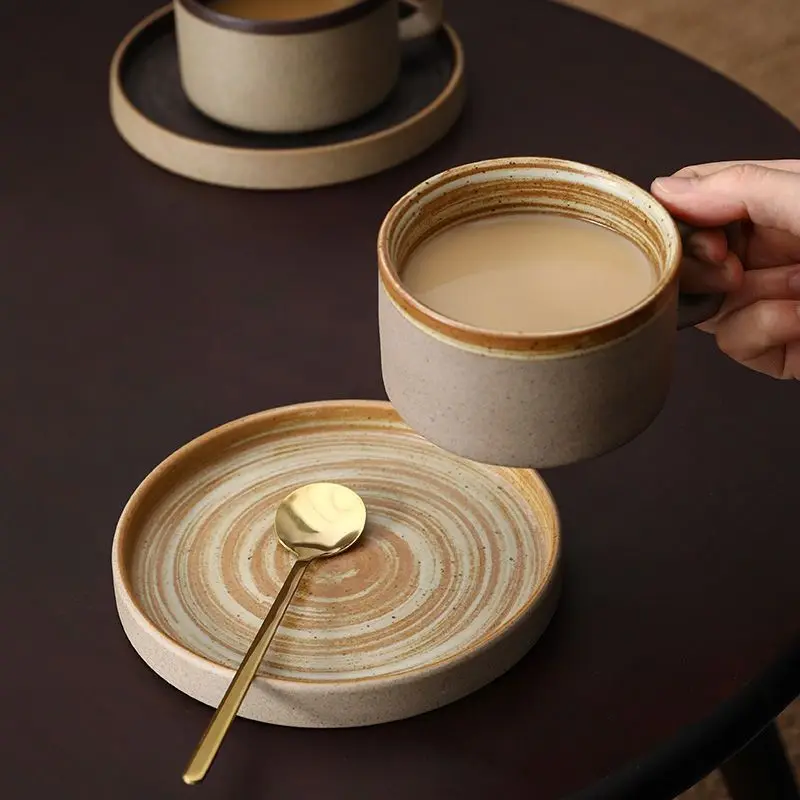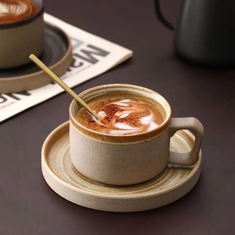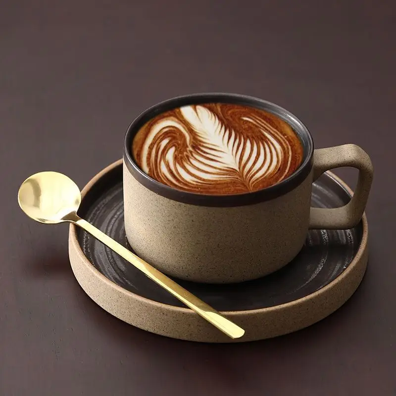 Enjoy your morning brew with this 330ml handmade coarse ceramic coffee cup and plate set. Featuring a retro design and including a matching spoon, this set is perfect for breakfast, coffee breaks, or casual home use.