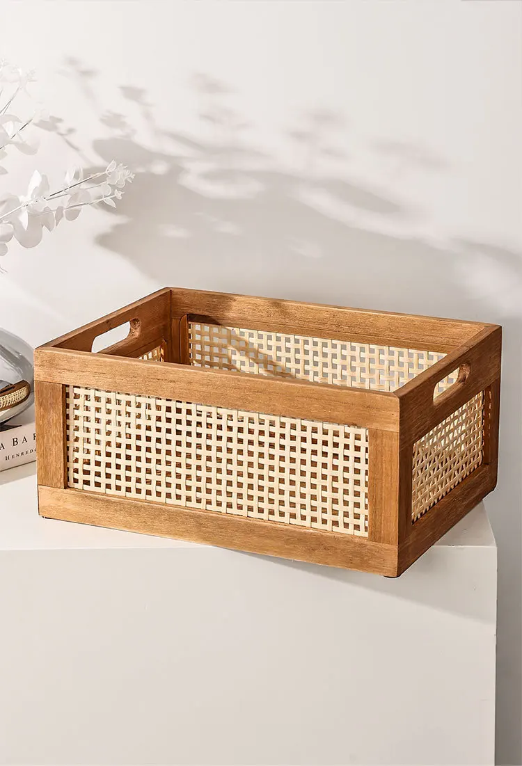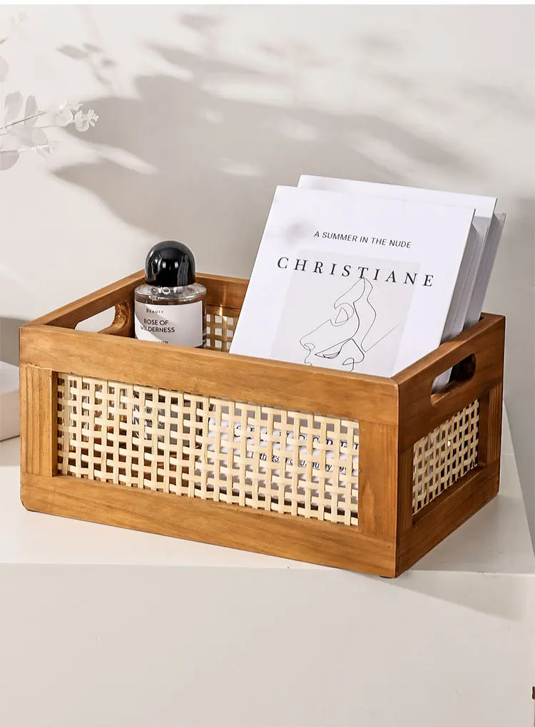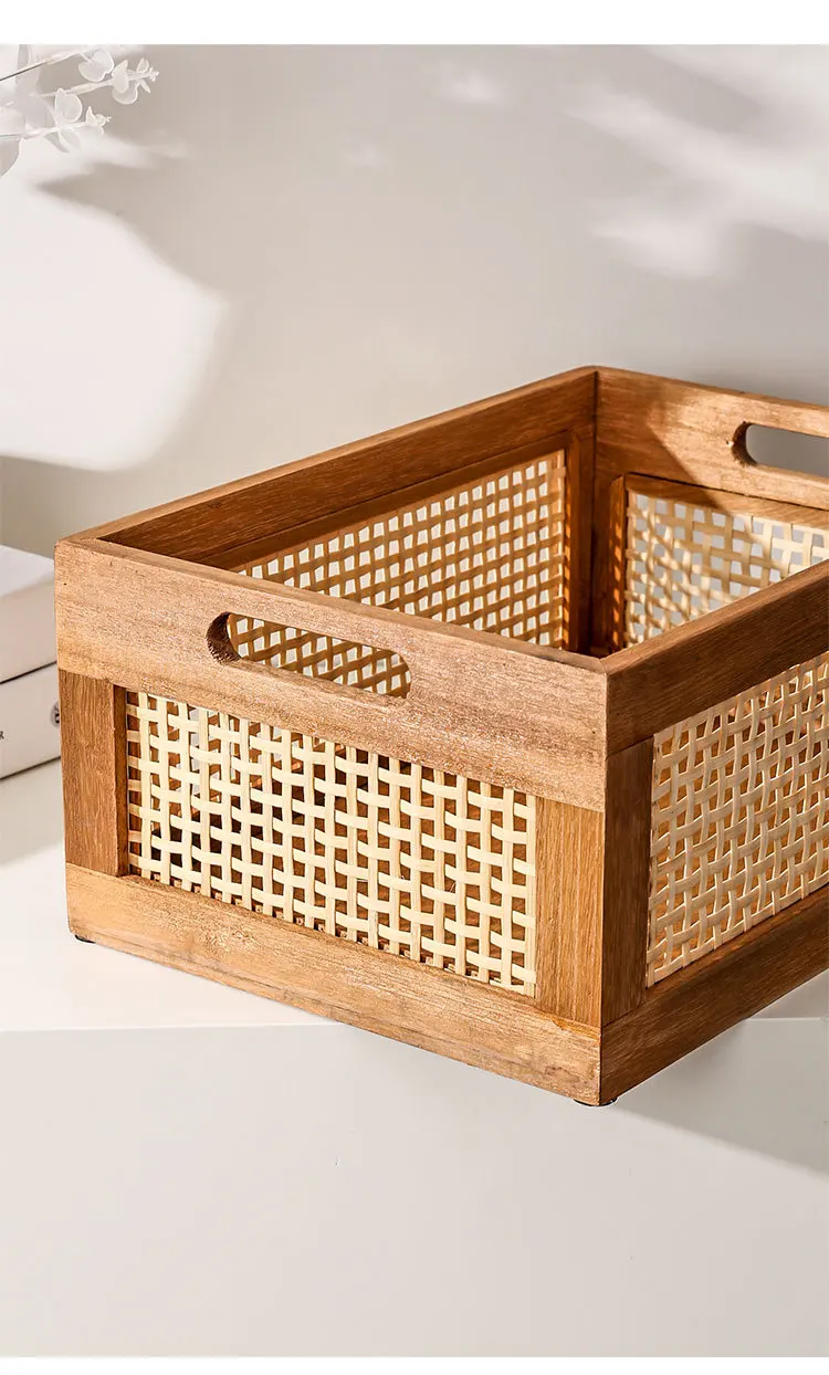 Solid Wood & Rattan Desktop Storage Box – Retro Organizer Basket