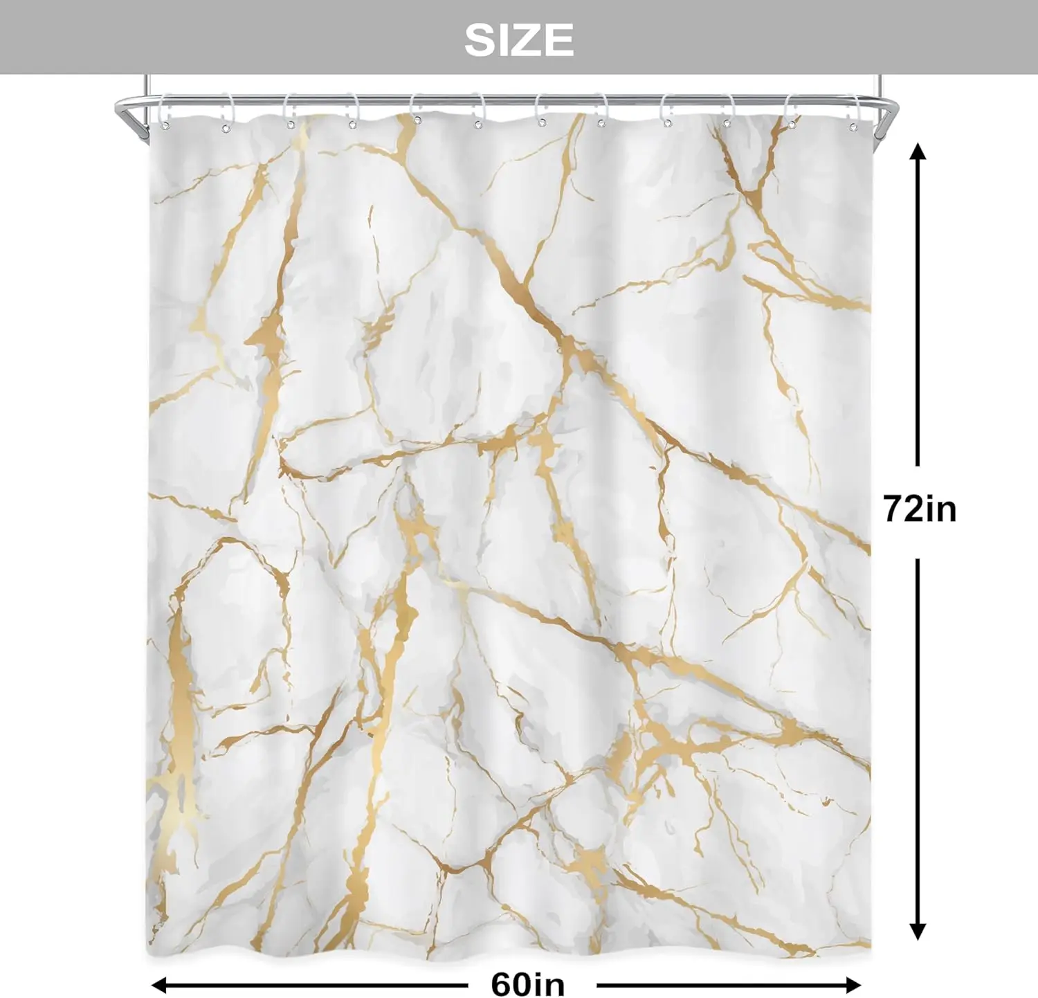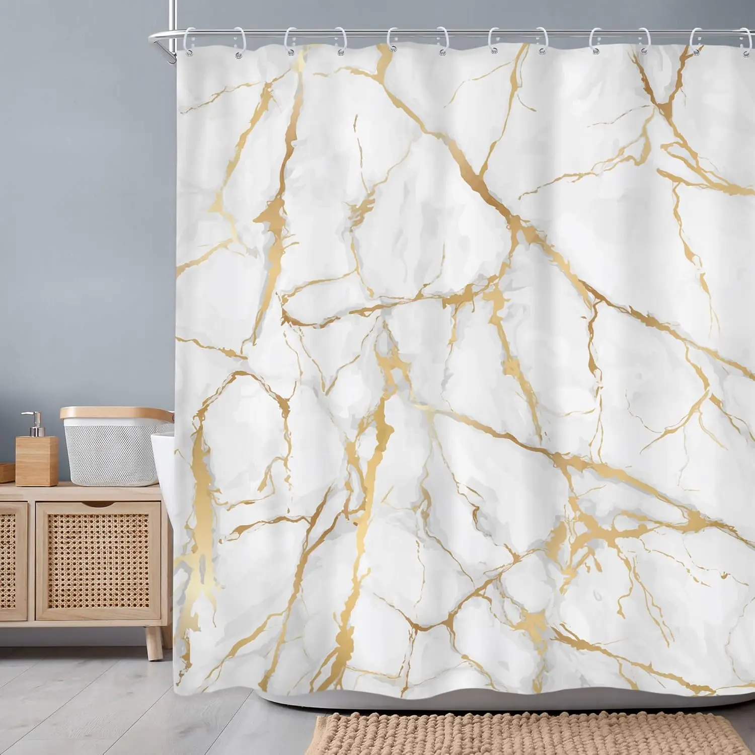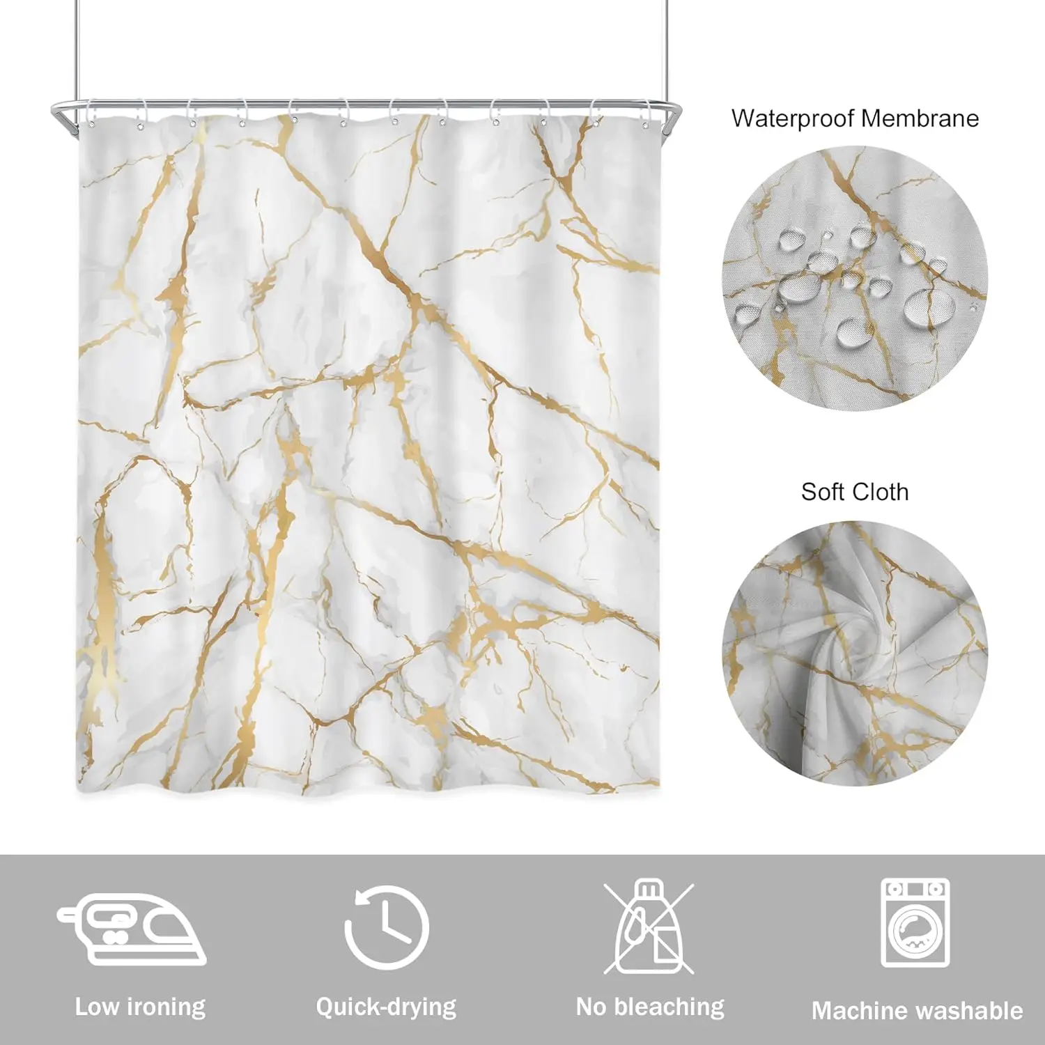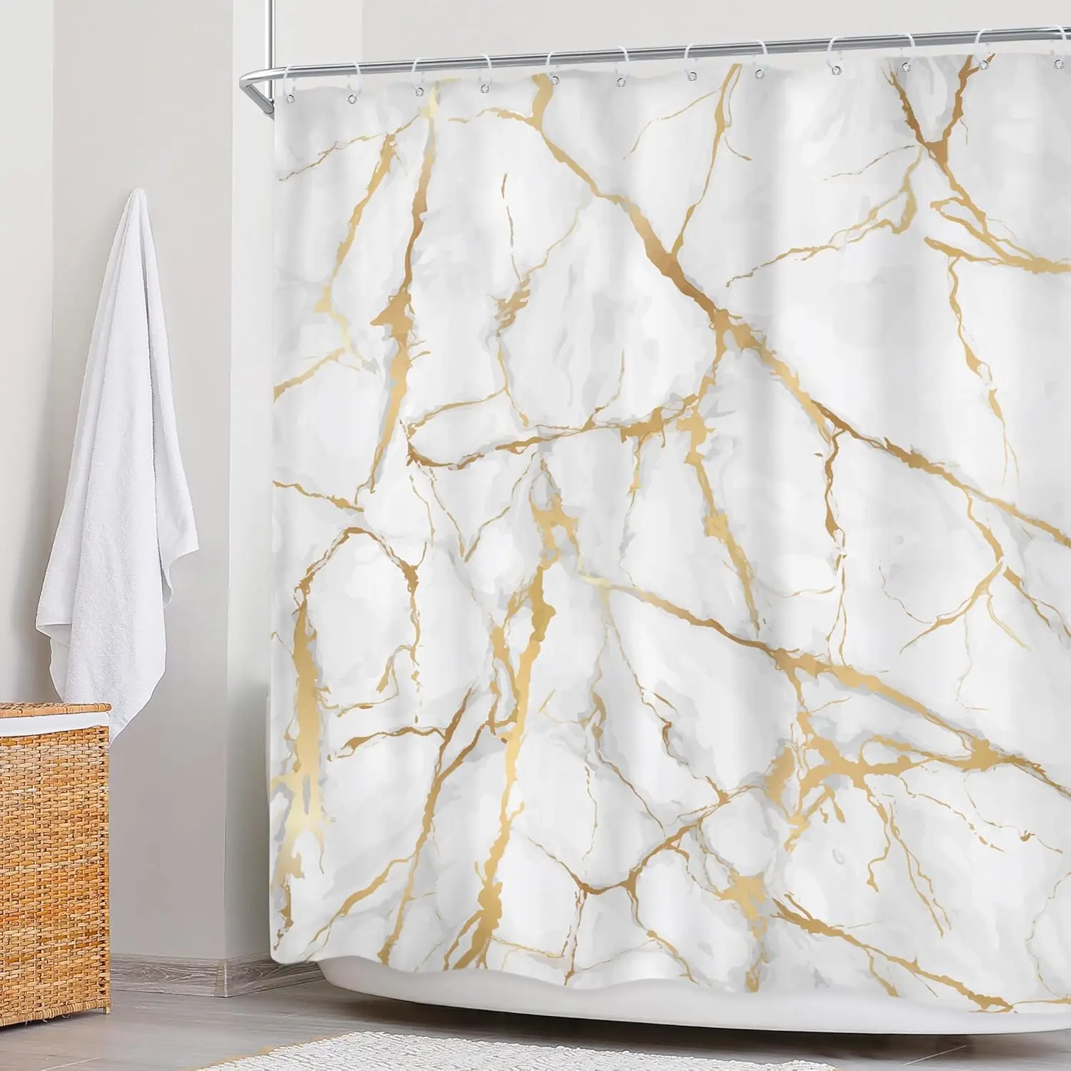 Bring luxury and modern artistry to your bathroom with this White and Gold Marble Shower Curtain. Featuring an abstract geometric design with liquid ink textures and gold accents, it transforms any shower space into a stylish centerpiece.